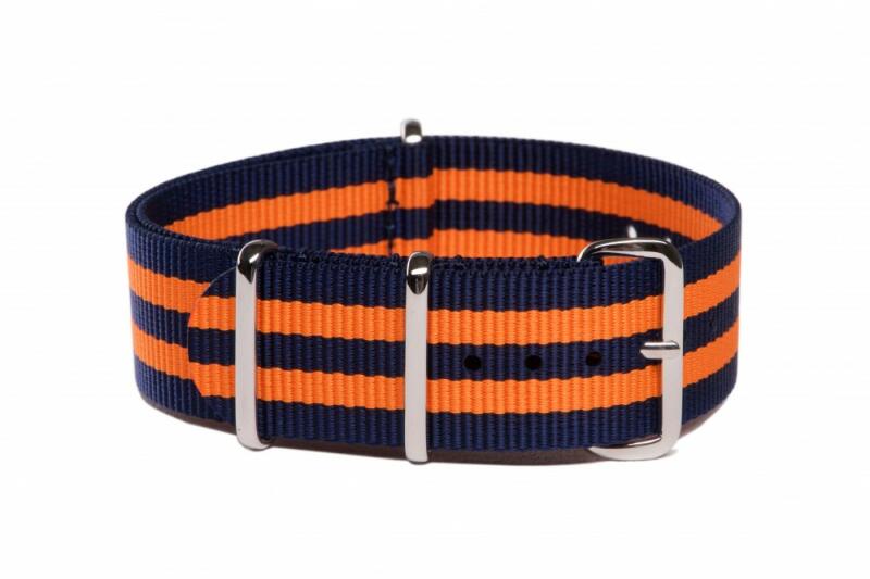 NATO óraszíj Ajánlott búvár (diver), katonai (military) és sportos stílusú karórához. Szín: sötétkék/narancs Anyaga: nylon textil, fényes acél csat Szélessége: 22 mm Hossz: 270 mm Vastagság: 1 mm Használja letölthetőméretezési segédletünket !