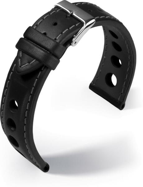 Kiváló minőségű bőr óraszíj a Rios márkától. A Racing óraszíj divatos, vintage megjelenésű, a lyukacsos design egyértelműen utal az autósport világának legendás arculatára. Színben igazodó varrással készült. A szíj 2 mm-t szűkül és 3mm vastag.