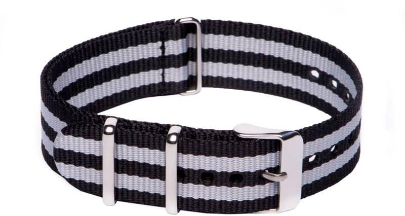 NATO óraszíj Ajánlott búvár (diver), katonai (military) és sportos stílusú karórához. Klasszikus viselet! Szín: fekete/halvány szürke Anyaga: nylon textil, fényes acél csat Szélessége: 22 mm Hossz: 270 mm Vastagság: 1 mm Használja letölthetőméretezési segédletünket !