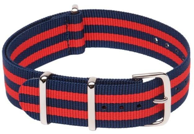 NATO óraszíj Ajánlott búvár (diver), katonai (military) és sportos stílusú karórához. Klasszikus viselet! Szín: sötétkék/piros Anyaga: nylon textil, fényes acél csatt Szélessége: 20 mm Hossz: 270 mm Vastagság: 1 mm Használja letölthetőméretezési segédletünket !