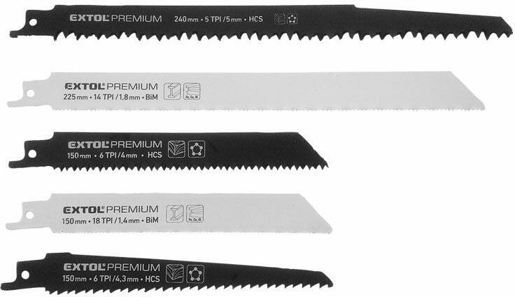 EXTOL Szablyafűrészlap készlet, Bosch befogás, HCS/Bimetál, fa, műanyag, fém anyagokhoz (5 db) Használható a következő gyártók gépeihez: AEG, Black&Decker, Bosch, DeWalt, EXTOL, Fein, Hitachi, Makita, Milford, Milwaukee, Rems, Rigid, Rockwell, Roller, Skill