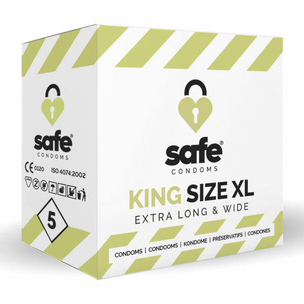 SAFE King Size XL - extra nagy óvszer (5db) Az átlagosnál nagyobb hímvesszővel áldott meg a sors?A normál méretű óvszerek kényelmetlenek?Extra nagy óvszerek, melyek maximális kényelmet és biztonságot nyújtanak akkor is, ha XL-es a pénisz méreted! Miért jó? Biztonságos n omál vastagságú óvszerek Ondótartállyal és síkosítással ellátva Anatómiai formával, melynek k