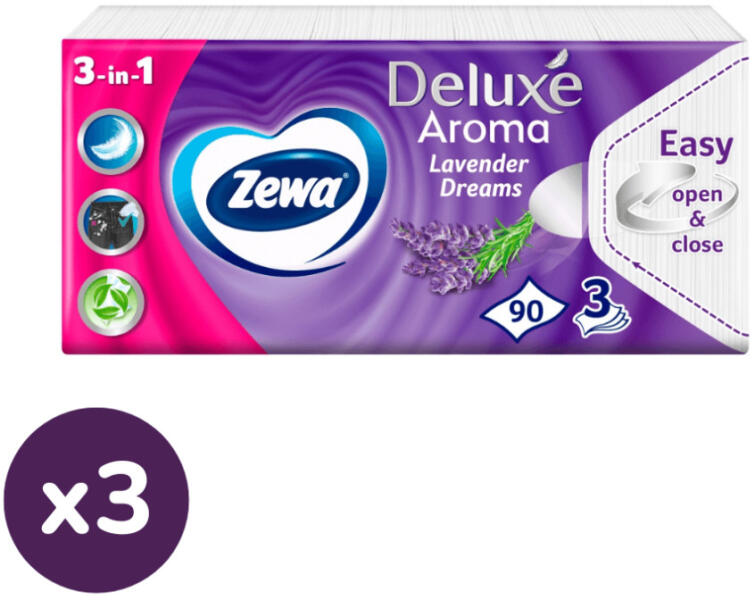 Zewa Deluxe Lavender Dreams: 3 rétegű, kényeztető puhaságú papír zsebkendő a levendula elegánsan meghitt illatával. Háromrétegű zsepi, kényeztető puhaság, amire mindig számíthat. Most új, a Zewa prémium gondoskodását hangsúlyozó csomagolásban kapható. Zewa Deluxe Lavender Dreams 3 rétegű illatosított papírzsebkendő (3x90 db)