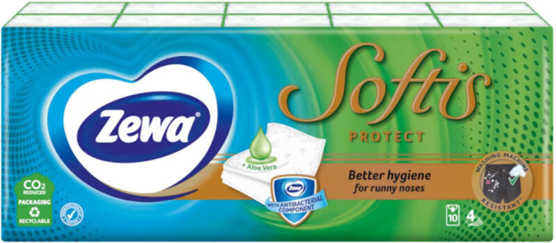 A Zewa Softis Protect Aloe vera balzsammal átitatott, friss illatú termék. Kellemes puhaságot biztosít a bőrnek. Az új Zewa Softis Procect mérsékli a ferzőző betegségek terjedésének lehetőségét a családban, mert antibakteriális és antiviriális összetételével csökkenti a korokozók számát a zsebkendőben.