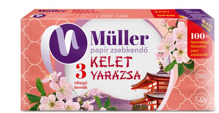 Kelet Varázsa illatú papír zsebkendőDarabszám: 100 db/csomagAnyag: 100 % cellulózRétegszám: 3 rétegűKiszerelés: 50 csomag/ PE zsák, 21 zsák/raklapKatalóguskód: 49846