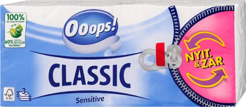 Az illatmentes, háromrtg. ű Ooops! Classic Sensitive papír zsebkendő nyitó-záró füllel rendelkezik, egyszerűbbé téve a mindennapi használatot.
