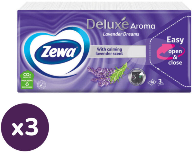 Zewa Deluxe Lavender Dreams: 3 rétegű, kényeztető puhaságú papír zsebkendő a levendula elegánsan meghitt illatával. Háromrétegű, kényeztető puhaság, amire mindig számíthat. Most új, a Zewa prémium gondoskodását hangsúlyozó csomagolásban kapható.