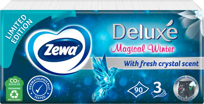Jó választás a család minden tagjának: az új Zewa Deluxe dobozok megbízhatóan jó minőségű papír zsebkendőt kínálnak. Orrfújáshoz, kozmetikai felhasználásra, kéztisztításra, gyümölcsök letörlésére... nincs olyan feladat a mindennapokban, amelyre ne tudnának megoldást. A dobozokat színes, vidám, könnyed design teszi mindenki kedvencévé. - mosógépbiztos- fehér