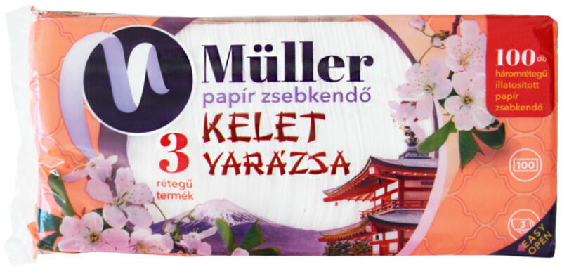 PAPÍRZSEBKENDŐ 3 RÉTEGŰ 100 DB/CSOMAG KELET VARÁZSA Kelet Varázsa illatú papír zsebkendő Darabszám: 100 db/csomag Anyag: 100 % cellulóz Rétegszám: 3 rétegű Kiszerelés: 50 csomag/ PE zsák, 21 zsák/raklap Katalóguskód: 49846