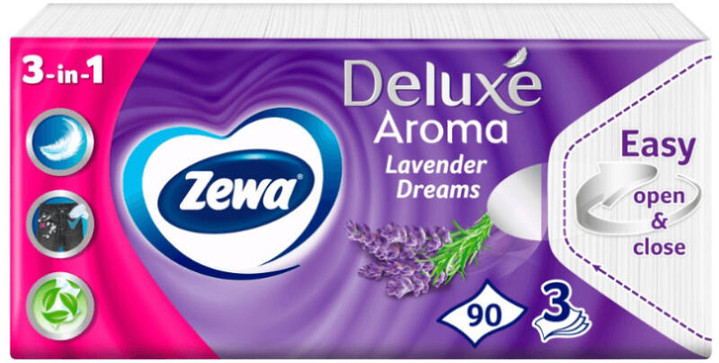 Zewa Deluxe Lavender Dreams: 3 rétegű, kényeztető puhaságú papír zsebkendő a levendula elegánsan meghitt illatával. Háromrétegű zsepi, kényeztető puhaság, amire mindig számíthat. Most új, a Zewa prémium gondoskodását hangsúlyozó csomagolásban kapható. Zewa Deluxe Lavender Dreams 3 rétegű illatosított papírzsebkendő (90 db)