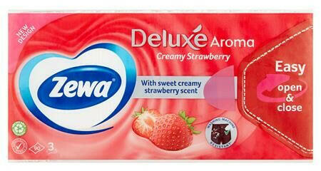 Papír zsebkendő, 3 rétegű, 90 db, ZEWA Deluxe, eper illatú (KHHZ08) Három rétegű puha papír zsebkendő. Eper illatú, a mentolos zsebkendő utóda. Kiszerelés: 90 db
