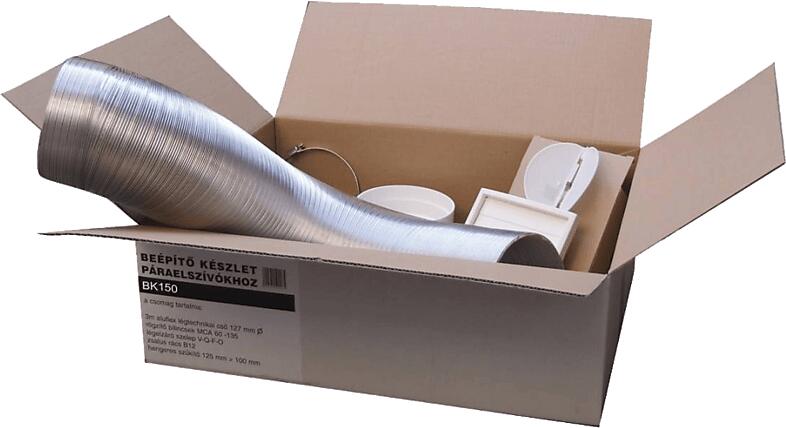 3 méter 150 mm átmérőjű többrétegű aluflex légtechnikai cső, zsalus rács, rögzítő bilincs, hengeres szűkítő, 150 mm átmérőjű kivezetésű páraelszívóhoz.