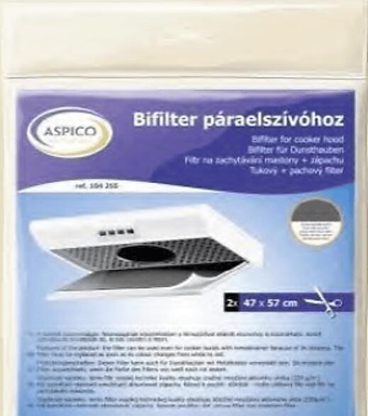 Aktív szén és zsírfilter is egyben. Méretre vágható. Cseréje használat gyakoriságától függően, de maximum 2 havonta ajánlott.