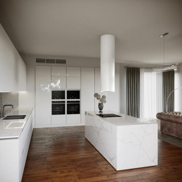 Ciarko Design Tubus W Long fehér sziget páraelszívó Síma, látható gombok nélküli felület és egyszerű forma, amely felkelti a figyelmét a minimalizmus és esztétika szerelmeseinek. Hengeres WARM2coldLED világítás. A kör alakú periférkius LED-világítás a piacon egyedülálló megoldás, amely tökéletesen megvilágítja a főzőlapot, ideális körülményeket biztosítva a f