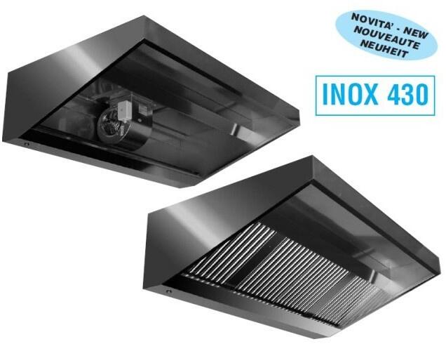 Inox fali "Snack" elszívóernyő kivehető mosható labirintus filterrel, zsírfogó vályúval és leeresztő csappal, beépített motor nélkül Anyaga: Inox430 acél Filterek száma: 2 db Filter méret: 400x500 mm Csatlakozó kivágás a készülék tetején: 300x300 mm Szerelési magassága pszt. -től mért: 1900-2000 mm Mérete: 1200x1100x450 mm