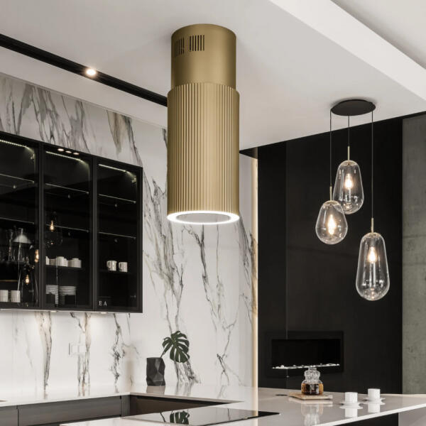 Ciarko Design Monogram W Gold sziget páraelszívó A készülék speciális kialakítású házán 84 barázda található. Hengeres WARM2ColdLED lámpatest. A kör alakú LED-lámpa tökéletesen megvilágítja a főzőlapot és kellemes hangulatot biztosít. A fény színének beállítása lehetővé teszi, hogy Ön a világítást a többi lámpához, illetve a helyiség hangulatához igazít