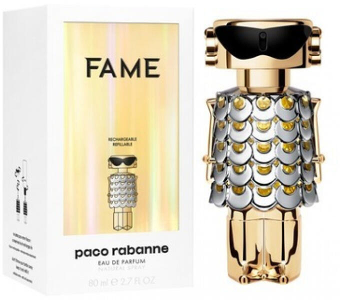 Rabanne FameFejmangó, bergamottSzívjázmin, tömjénAlapszantálfa, vaníliaAz illat fajtájagyümölcsös, virágos, fásFenntarthatóságújratölthető kivitelVállalja mindegyik arcát, és ragyogjon! Mutassa meg, milyen egyedi és erős. A Rabanne Fame női Eau de Parfum csupa játékosság és érzékiség, ugyanakkor mindenkit hatalmába kerít. Az illat az avantgárd luxust és a párizs