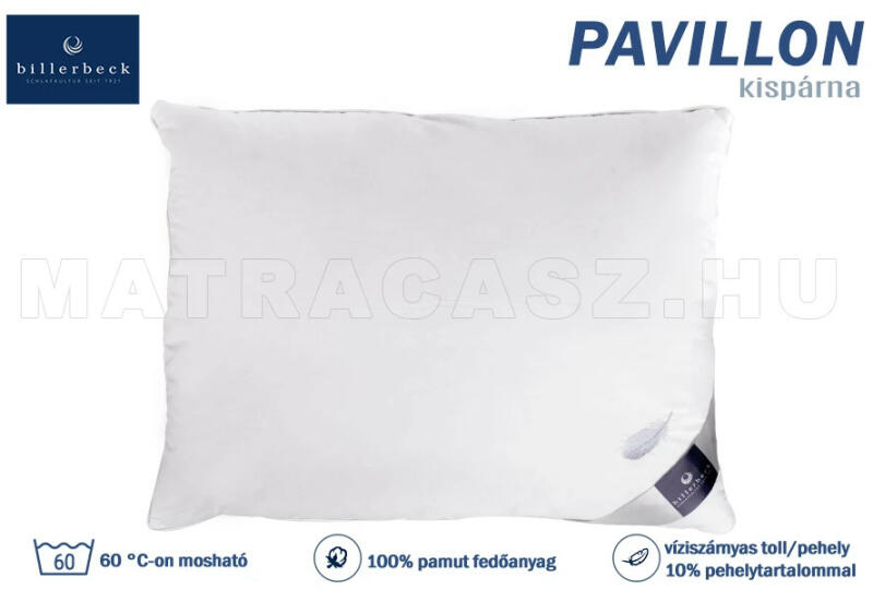 A Beillerbeck Pavillon toll/pehely kispárna egy kényelmes és megfizethető választás a Billerbeck kollekcióból a hagyományos toll párnákat kedvelők számára. Tökéletesen puha, így hason alvóknak is ideális választás. A Pavillon párna kényelmes és puha huzata 100% pamut melynek szélei körben kék mintás paszpóllal vannak díszítve. A töltet víziszárnyas toll 10% pehely