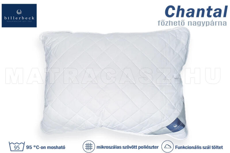 Billerbeck Chantal funkcionális szál töltetű nagypárna megnövelt pára-áteresztő képességgel rendelkező, bőrbarát anyagok felhasználásával. A Billerbeck CHANTAL párnái megnövelt pára-áteresztő képességgel rendelkező, bőrbarát anyagok felhasználásával, ideális alváskomfortot kínáló termékek. Ideális töltet, amely hosszú távon biztosítja a kellemes pihenést.