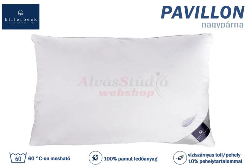 A Beillerbeck Pavillon toll/pehely nagypárna egy kényelmes és megfizethető választás a Billerbeck kollekcióból a hagyományos toll párnákat kedvelők számára. Tökéletesen puha, így hason alvóknak is ideális választás. A Pavillon párna kényelmes és puha huzata 100% pamut melynek szélei körben kék mintás paszpóllal vannak díszítve. A töltet víziszárnyas toll 10% pehel