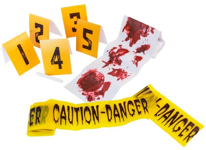 Szett - Tetthely 8 db A tetthelyről származó szalag és számokat tartalmazó készletünk tökéletes kiegészítő egy hiteles és kísérteties hangulat megteremtéséhez! Ez a készlet mindent tartalmaz, ami egy valósághű tetthely elkészítéséhez szükséges. tartalom : számos kártyák 1 - 5, 1x szalag Caution - Danger, 1 x szalag véres nyomokkal