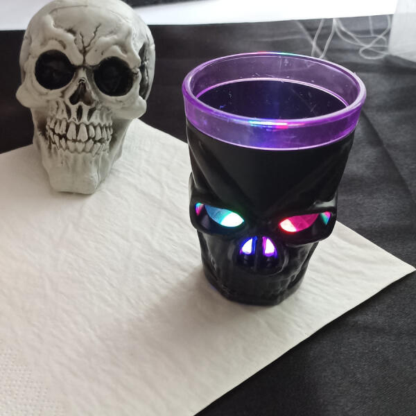 LED-es halloweeni party pohár, koponya alakú Műanyag LED-es pohár Színe: fekete - lila Mérete: 7*5*5 cm