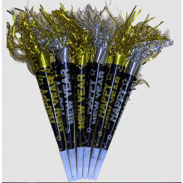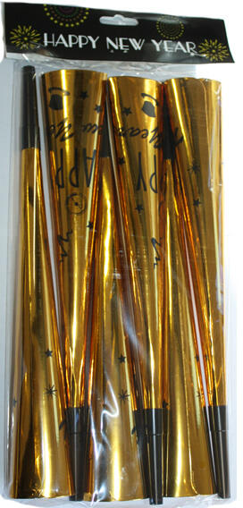 Papír trombita, 6 db. Arany színű Happy New Year felirattal. Csak csomagra vásárolható!