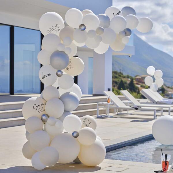 Lufi girland - fehér és ezüst színű lánybúcsú Lufik egyedi és esztétikus kiegészítője minden pártinak vagy társasági eseménynek . Készítsen tematikus lufi díszítést a Lánybúcsúra, és éljen át egy feledhetetlen napot. tartalom : 75 db lufi (8 x 30cm, 6 x 25cm, 5 x 12cm ezüst chróm lufi , 1 x 45cm, 12 x 30cm, 12 x 25cm, 8 x 12cm fehér lufi , 1 x 45cm, 6 x 30cm, 5 x 25c