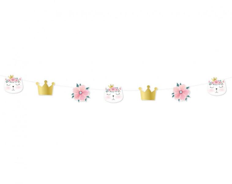 Papír girland - Macska, 300 cm A macska motívumú girland remek kelléke a parti dekorációnak . Egyetlen születésnapi ünneplés sem teljes girland nélkül. Ez a színes parti dekoráció alkalmas gyermek születésnapi vagy gyerek partira . A girland cicák, virágok és arany koronák motívumaival készült. mennyiség : 1 db méret : 300 cm