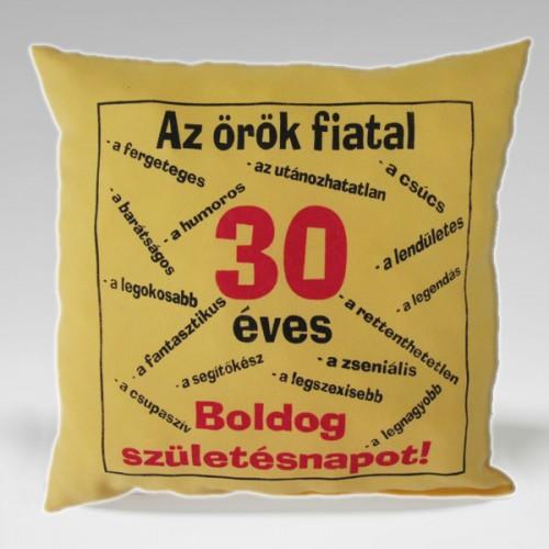 Tréfás párna 30. szülinapra - Az örök fiatal felirattal. Kiváló vicces ajándéktárgy 30-as ismerősöd szülinapjára. Szín: sárga Mérete: 29 x 26cm Töltelék: habszivacs, vatelin