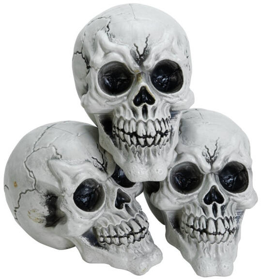 Sok kultúrában a koponyákat az élet végének és a mulandóság szimbólumainak tekintik. A hátborzongató sötétséget, a rejtélyt és a titokzatost képviselik. Emiatt minden Halloween és kísérteties buli nélkülözhetetlen "must have"-ja. 3db-ból álló műanyag koponya készlet, dekroráció halloweenre 1 koponya kb 15*11*13 cm
