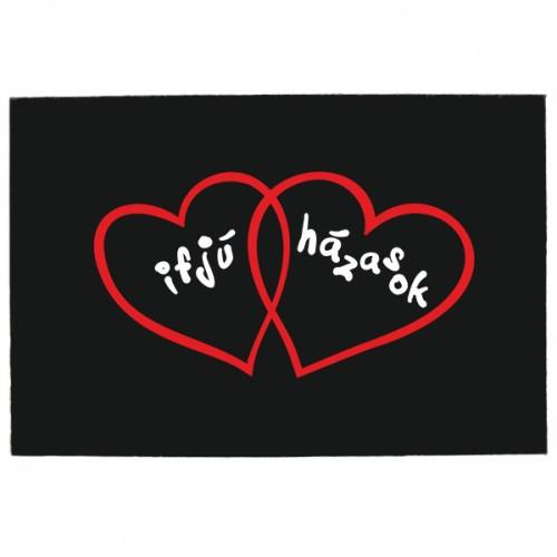 Gumis lábtörlő Ifjú házasok felirattal. Duplaszíves lábtörlő az ifjú párnak, fiatal házasoknak. Ajándék ötlet szülinapra, névnapra, barátoknak, rokonoknak, kollégáknak. Fekete lábtörlő frappáns felirattal, gumírozott hátoldallal. Mérete: 60 cm x 40 cm Anyaga: textil, gumi