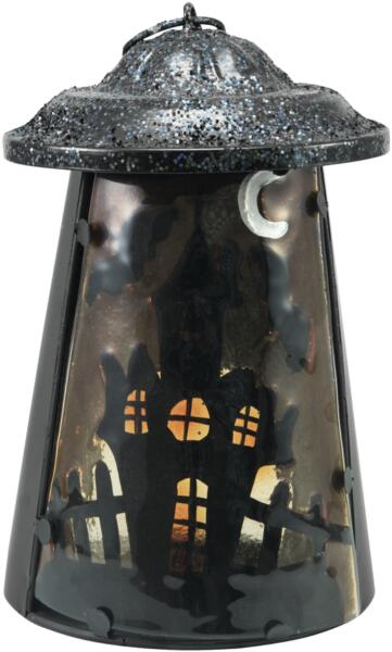 Lantern with haunted house The metal lantern from Europalms is a real eye-catcher thanks to a ghost house motif worked into real glass. Its flickering candlelight bathes the surroundings in devilish light and creates a very special atmosphere. To be on the safe side there is a metal tealight holder inside the lantern, into which a large tealight can be inserted. An opening on the back makes a simp