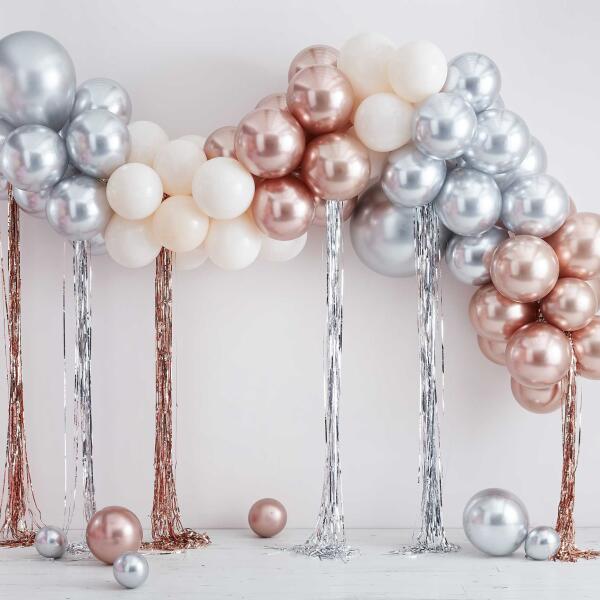 Lufi girland - Metalikus szalagokkal A lufik egyedi, esztétikus kiegészítői minden partinak vagy társasági eseménynek. Készítsen lufi dekorációt a partira és varázsoljon egy felejthetetlen ünnepséget. A lufi girland 95 db lufit és 2 csomag szalagot / függönyt tartalmaz : Ezüst króm lufi : 23 db - 30 cm, 8 db - 13 cm Kétrétegű fehér lufi : 20 db - 30 cm Rózsaszín arany kr