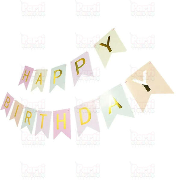 Happy birthday feliratos pasztell színű függő dekoráció születésnapra. A zászlók különböző színűek. A betűk pedig csillogó arany színben pompáznak. Happy birthday feliratos pasztell színű függő dekoráció születésnapra. A zászlók különböző színűek. A betűk pedig csillogó arany színben pompáznak. Egy betűzászló mérete: 16cm x 20cm zászlónként. Anyaga: p