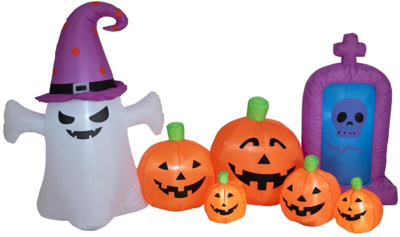 Self-inflating Halloween scene, ghost with pumpkins and gravestone as decoration object The inflatable Halloween scene from Europalms is the ideal alternative for all those who don't have time for elaborate event decorations in their hectic everyday lives. This uncomplicated solution allows you to conjure up a spooky Halloween atmosphere in just a few simple steps. The interconnected scenery consi