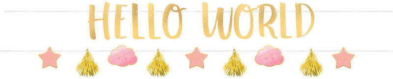 Banner Hello World - rózsaszín Banner Hello world felirattal alkalmas a gyerek és kismama kórházból történő hazatérésének megünneplésére. tartalom : 2 részből ál méretek : 176.8 x 17.8 cm / 176.8 x 11,4 cm