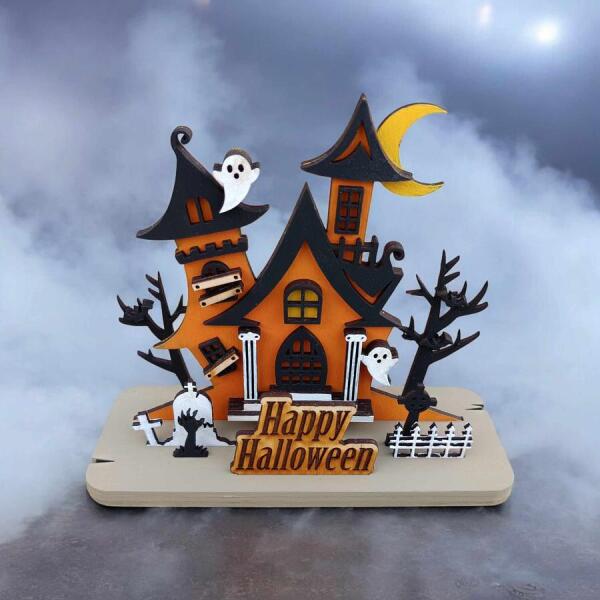 Dobd fel otthonod hangulatát ezzel a különleges Halloween asztali dekorációval ! Ez a 18 x 7 x 16 cm-es, nyírfából készült dekoráció tökéletesen illeszkedik bármelyik asztalra, polcra vagy ablakpárkányra, és garantáltan igazi Halloween atmoszférát varázsol. Az igényesen festett minták igazán kísértetiesek: egy rémisztő kastély, kísértetjárta temető, szellemek, val