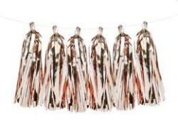 Nagyszerű dekoráció! A csomag 12 db fényes rózsaarany színű rojtos dekorációt tartalmaz. A füzért neked kell összeszerelni! Méret: a csomagban található fehér madzag 2 méter hosszú. A rojt dekoráció 30 cm hosszú.
