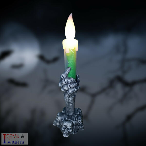 Egyedi halloweeni gyertya, zöld színben. Melegfehér fényével hangulatos világítást biztosít az őszi éjszakába. Melegfehér fényű, LED-es halloweeni gyertya Anyaga: műanyag Működés: 3db LR44 típusú gombelemmel - tartozék Méret: 16*4*4 cm