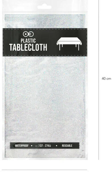 Eldobható, műanyag asztal terítő. Mérete: 137 cm x 274 cm. Színe: hologramos ezüst.