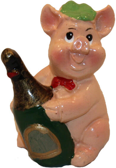 Pezsgős üveget tartó malac kabala. Magassága: 4,5 cm. Anyaga: polyston.