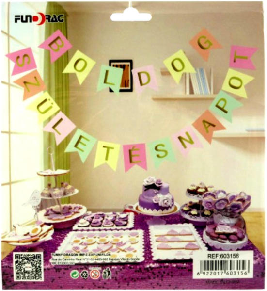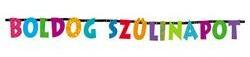 Színes, vidám színű, Boldog Szülinapot feliratot megformáló betűfüzér. Mérete: a füzér teljes hossza: 230 cm, szélessége: 19,5 cm.