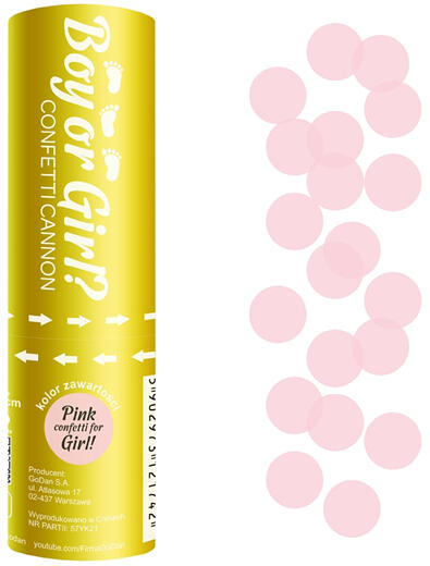 Konfetti kilövő, 15 cm-es rózsaszín konfetti pöttyökkel.