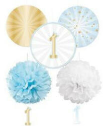 A csomag 3 db 30 cm átmérőjű legyezőt, és 2 db 40 cm átmérőjű bolyhos függő dekorációt tartalmaz. Anyaga: papír. 5 db dekoráció/csomag.