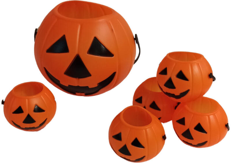 Tök mintás halloweeni plasztik vödrök 1 nagy és 5 kicsi Műanyag halloweeni vödröcskék Méret: kicsi : 6,5x4,5 cm nagy: 16*16*13 cm 1 csomag / 6 db