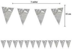 Fényes ezüstszínű háromszög alakú zászlók füzéren. Mérete: 10 m x 16 cm. Összesen 12 db zászló van a füzéren. Anyaga: fólia.