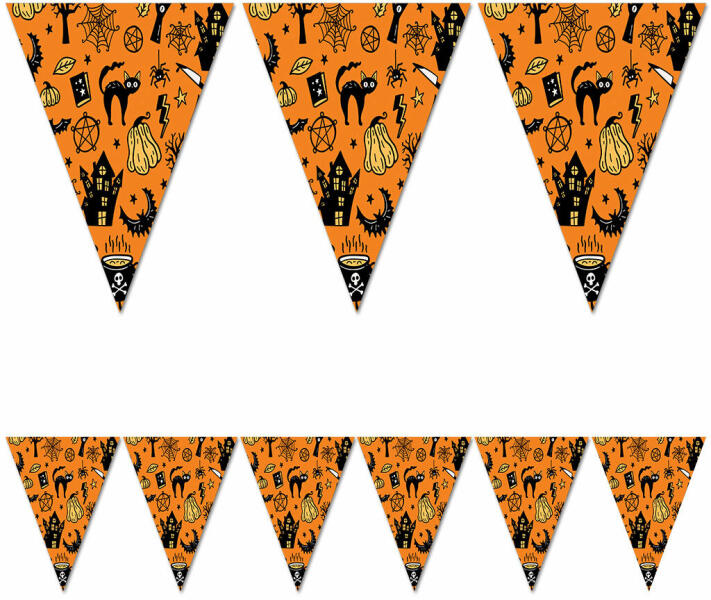 Narancssárga és fekete színű, különféle félelmetes Halloween mintás zászlófüzér, két oldalon nyomva a lehető legfélelmetesebb Halloweeni hangulatért. A halloween zászlófüzér Hangulatfokozó: Ez a szépen elkészített, igényes kivitelezésű halloween zászlófüzér félelmetes és rémisztő, igazi halloween hangulatot teremt, amely garantáltan hozzájárul a partin való