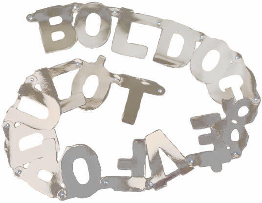 Fűzér, BOLDOG ÉVFORDULÓT felirat, fényes papírból.