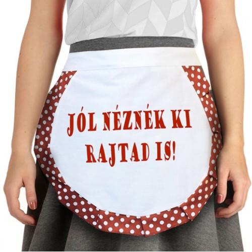 Kötény - Jól néznék ki rajtad is felirattal Születésnapra, névnapra, házassági évfordulóra, karácsonyra ajándékozz tréfás feliratozású kötényt. Mérete: 70 cm x 51cm Anyaga és alapszíne: fehér vászon, széle piros, fehér pettyes.